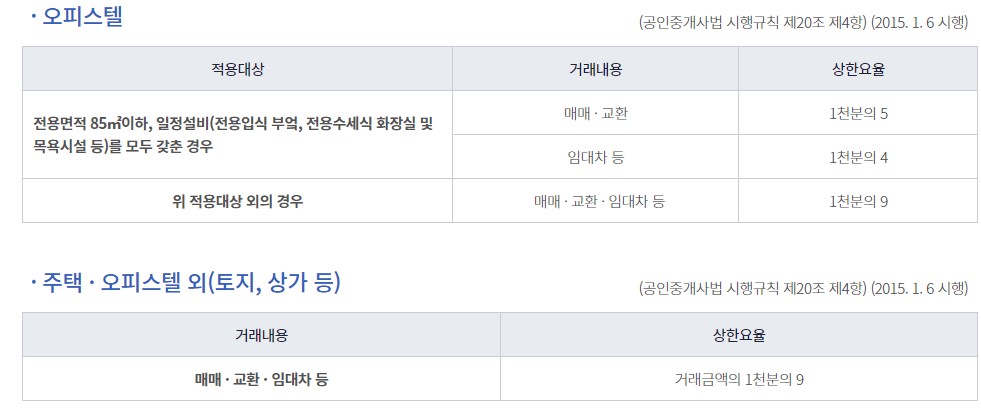 - 주거용 오피스텔 기준에 적용되지 않을 경우, 거래금액의 1천분의 9 이내에서 중개 의뢰인과 개업공인중개사가 서로 협의하여 결정합니다.